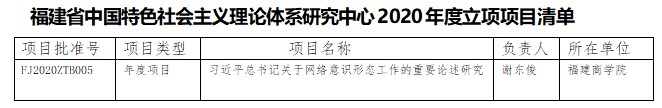 近日,中共福建省委宣传部公布了福建省中国特色社会主义理论体系研究中心2020年立项项目清单。betway西汉姆联官方官网谢东俊老师主持申报的《习近平总书记关于网络意识形态工作的重要论述研究》(项目编号:FJ2020ZTB005)被遴选为福建省中国特色社会主义理论体系研究中心年度项目。
