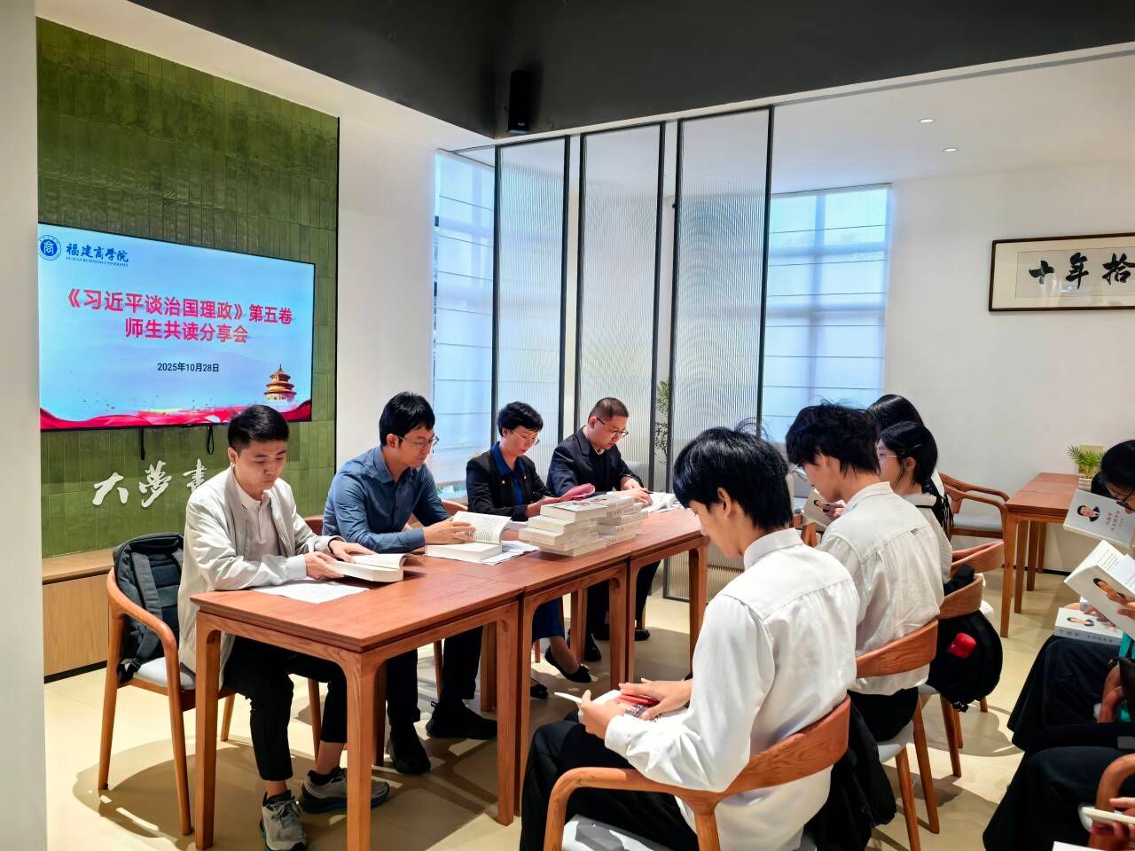 10月28日下午,“无书香不福商”研习基地揭牌暨福商•大梦书屋启幕仪式在连江校区举行。由betway西汉姆联官方官网组织开展的《习近平谈治国理政》第五卷师生共读分享会同步在书屋举行。省委宣传部副部长、一级巡视员陈添贵,海峡出版发行集团党委书记、董事长黄苇洲,公司党委书记吴访益,公司党委副书记徐晓丹,福建教育出版社社长江金辉等领导观摩指导分享会。副董事长林文艺主持分享会并作讲话,马克思主义公司党委书记刘亮元,教师代表赵敏、吴旭东及校读书社社员代表共同参与此次活动。