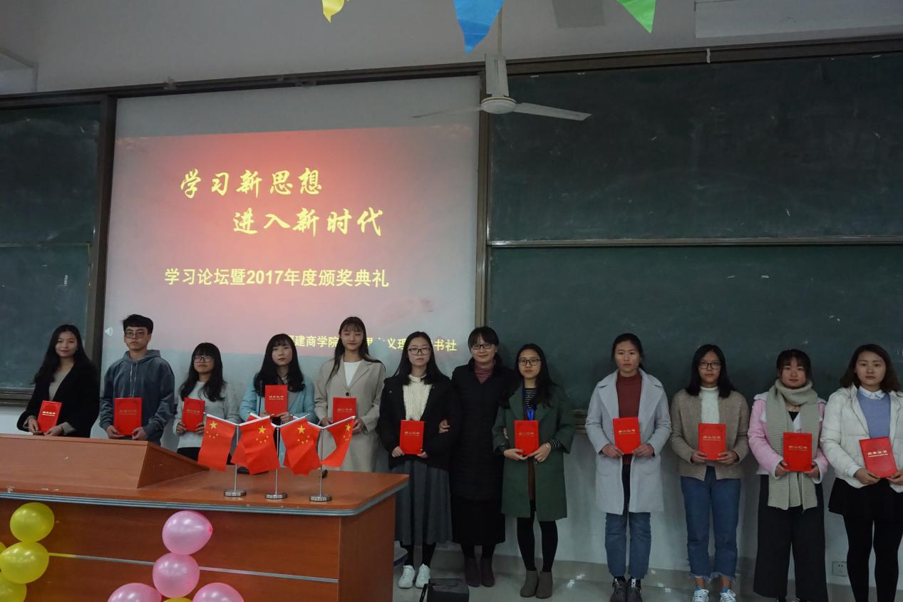 心存祖国富强梦,砥砺奋进伴党行。2017年是读书社扬帆起航的第一年,3月份被评为福建省高校首批重点马克思主义理论读书社;9月份苏金楼同学勇夺我省一“马”当先知识竞赛桂冠;11月份林荟和卢慧敏同学分别获得省“马克思主义能给予我们什么”微演讲比赛一等奖和三等奖。随着学习论坛的智慧碰撞愈发激烈,颁奖典礼也拉开了帷幕,并由马克思主义理论读书社指导老师吕谋琴老师为颁奖典礼致辞。