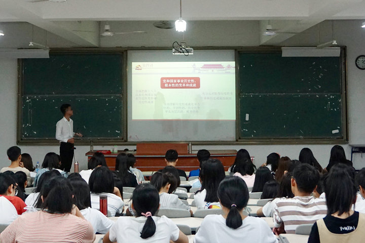 9月26日晚,公司习近平新时代中国特色社会主义思想读书社在连江校区诚信楼大阶一教室开展第二场员工小分队“大宣讲”活动。本次宣讲以“《习近平新时代中国特色社会主义思想三十讲》导读”为主题,由读书社理论骨干宣讲小分队成员、福建省第二季老员工学习马克思主义理论知识竞赛本科组冠军苏金楼同学面向管理工程系2018级会展经济与管理专业的新生进行宣讲。